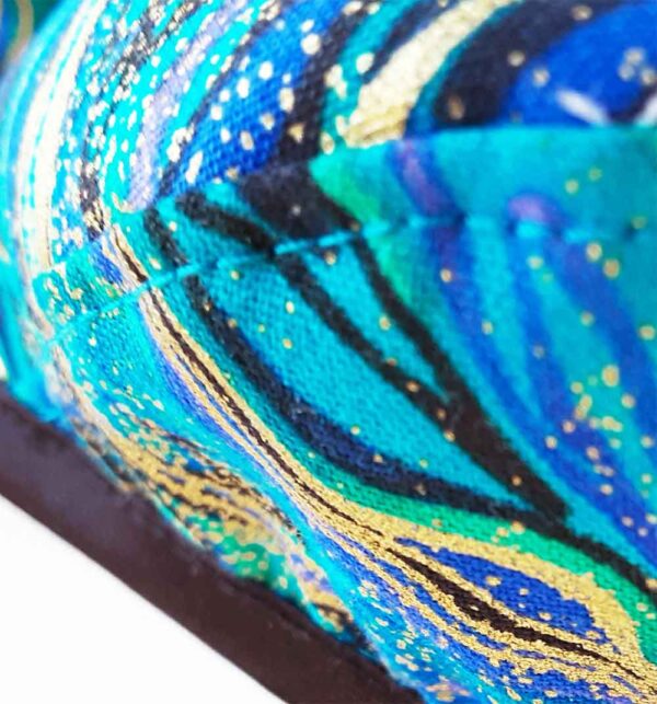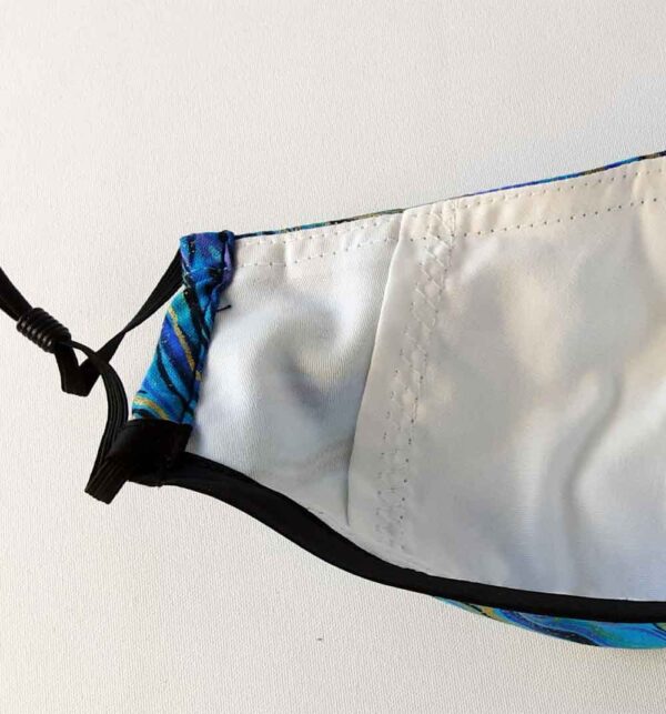 Gold Marble Ripple. Step out in style in this sophisticated gold marble ripple mask. The outer skin is a top quality cotton with a subtle sheen to it. The mask is finished with a black satin binding, black ear-loops and toggles.