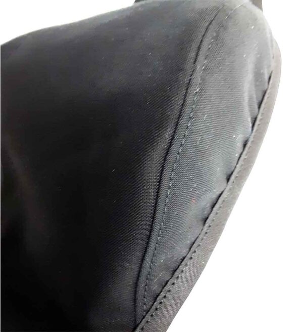 Ink black mask. The outer skin is top quality cotton with a subtle sheen to it. The mask is finished with a black cotton binding, black ear-loops and toggles.