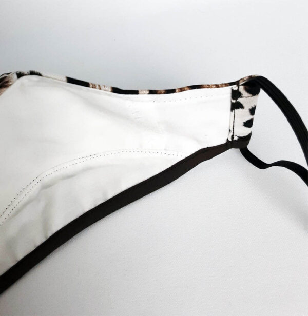 Leopard Mask – Step out in style in this sophisticated digitally produced animal print. The outer skin is a soft and sumptuous top quality stretch cotton with a subtle sheen to it. The print is quite a small leopard skin in natural colours. (Placement of the pattern may vary slightly from the photo on each mask.) The mask is finished with a mocha binding, black ear-loops and toggles.